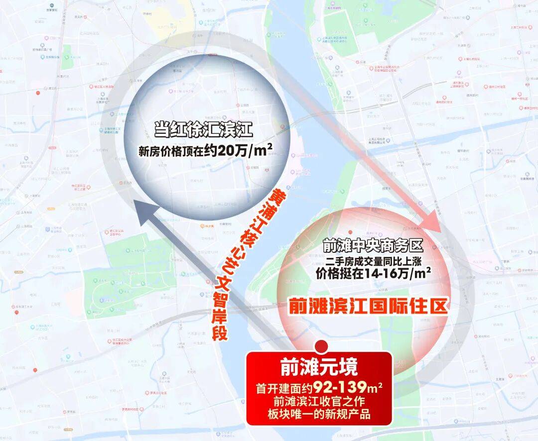 这段江是黄浦段,价值已在新房市场强势兑现。对岸徐汇滨江房价冲击20万/㎡;前滩商务区二手房坚挺,前滩滨江的前滩润璟、百合园、前滩公馆等连开连捷,片区楼市热度居高不下。