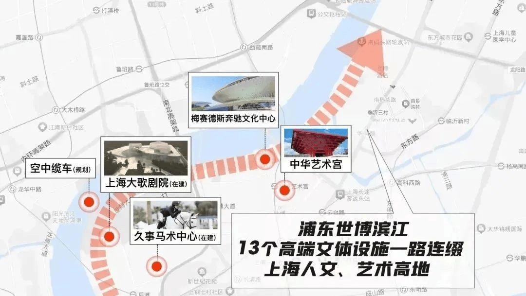 世博-后滩浓缩了全上海规格最高的文体配套,梅赛德斯奔驰文化中心、中华艺术宫、上海大歌剧院、世博展览馆、久事国际马术中心等都在这里,形成一条上海独具一格的文化艺术带。