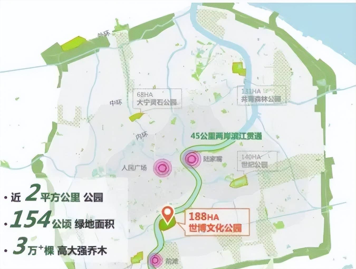 世博文化公园的面积更大,共计近2平方公里,相当于25个人民公园,是中心城区最大的公园绿地。另外,世博文化公园旁边还有面积达2.5平方公里的黄浦江水域,公园可与这一广阔水域相融。